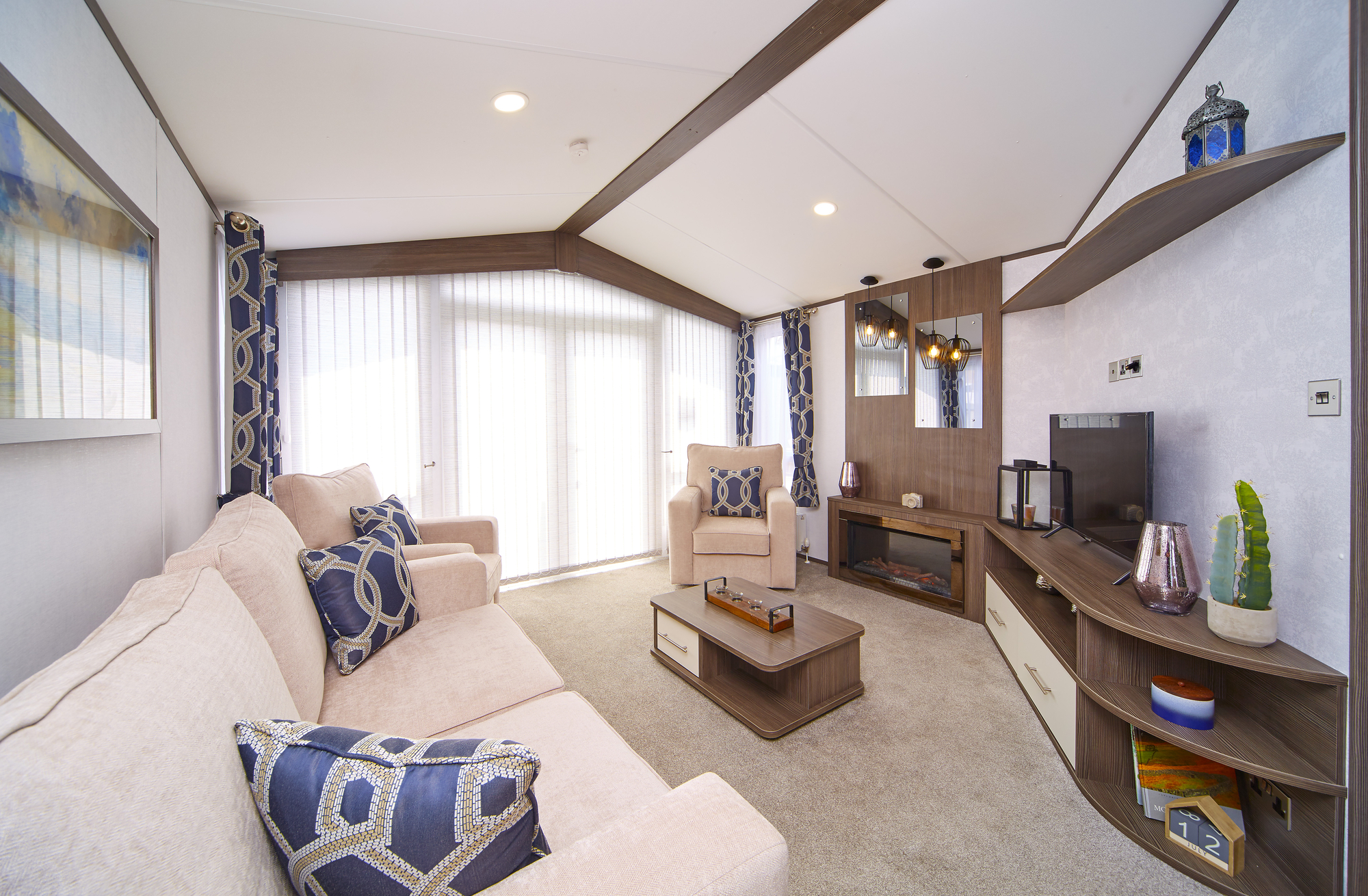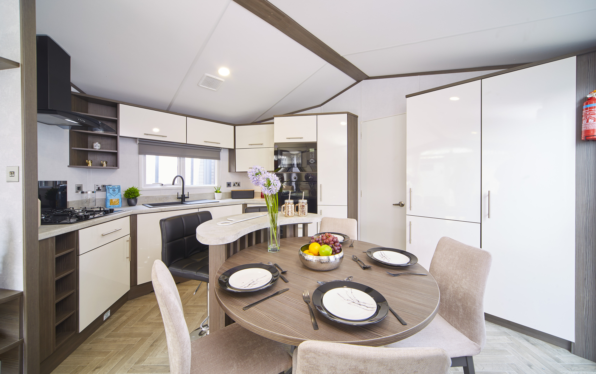 Vous êtes chaque fois surpris de la sensation d’espace incroyable quand vous entrez dans la caravane résidentielle Aspen: un living ouvert avec des fauteuils séparés pour une mise en place flexible, des fenêtres jusqu’au sol pour un éclairage maximal et une kitchenette séparée. La table à manger ronde et l’îlot de cuisine sont parfaits pour se raconter des histoires nouvelles et de ressusciter de vieux souvenirs. Les versions avec deux chambres à coucher ont chaque fois deux salles de bains : une avec une douche spacieuse et une avec baignoire.