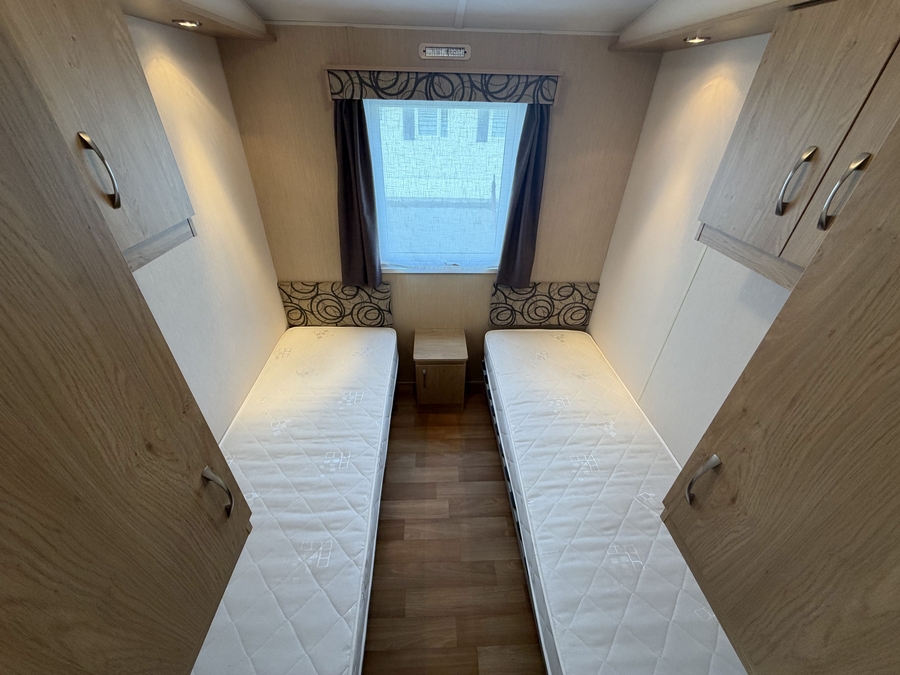 - 2 slaapkamers: één met tweepersoonsbed en ingebouwde kasten, één met twee eenpersoonsbedden