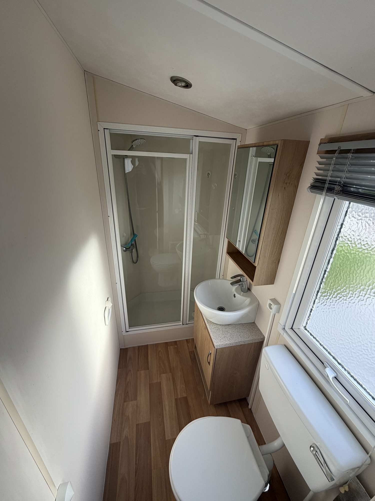 - badkamer met douche, toilet, lavabo en opbergruimte