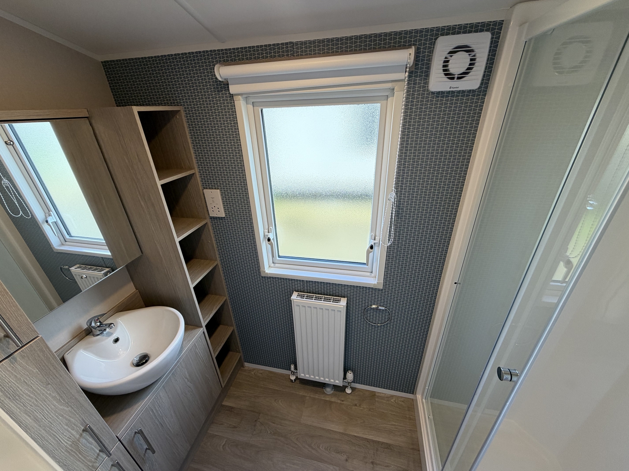- Moderne badkamer met douche, toilet, lavabo en opbergruimte