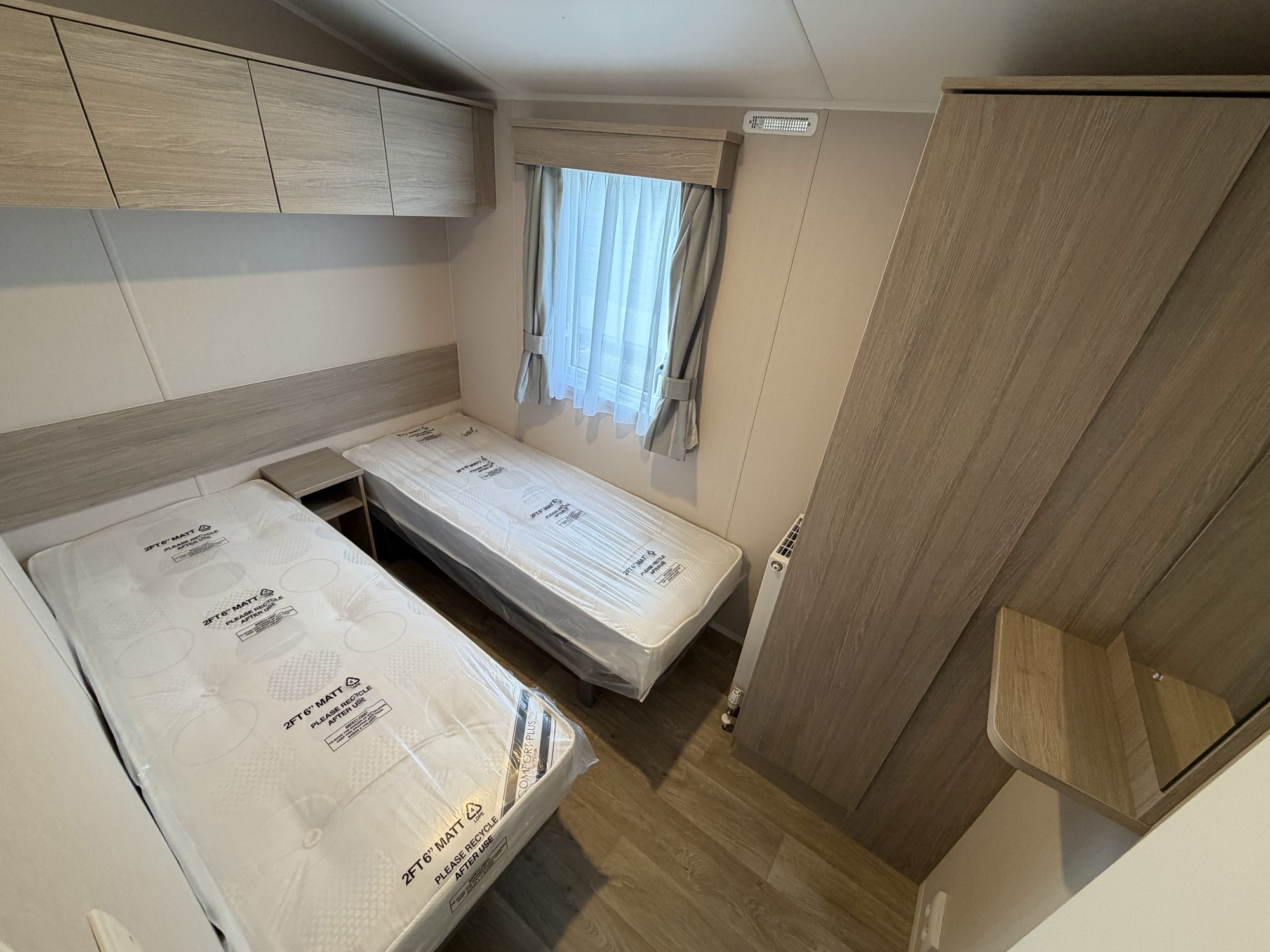 - 2 slaapkamers: één met tweepersoonsbed, één met twee eenpersoonsbedden, beiden met ingebouwde kasten