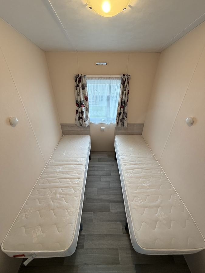 - 2 slaapkamers: één met tweepersoonsbed en ingebouwde kasten, één met twee eenpersoonsbedden