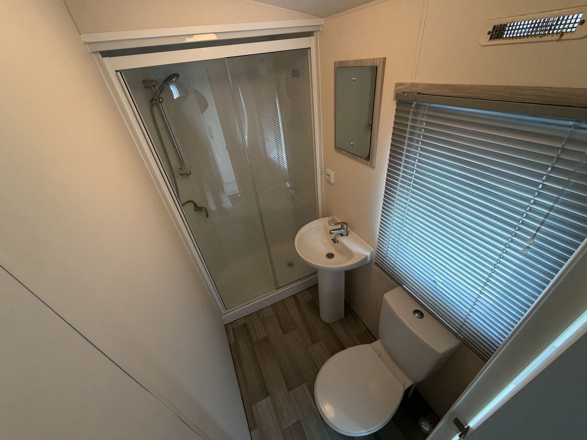 - badkamer met douche, toilet, lavabo en opbergruimte